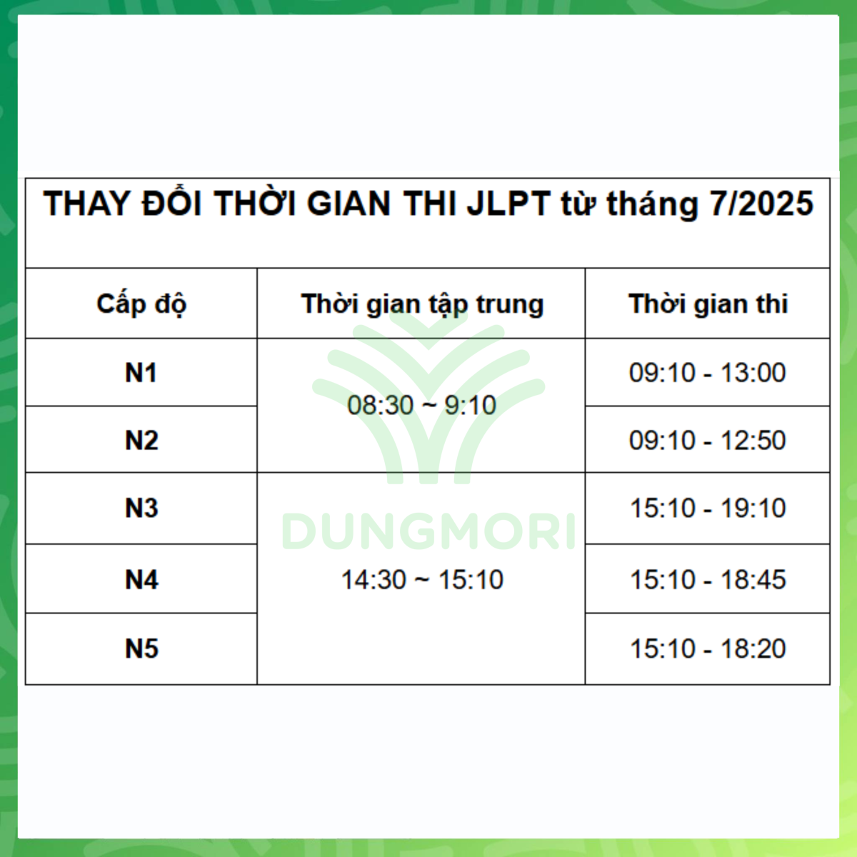 + N3–N5 thi vào 15:10 giờ Nhật (~13:10 giờ Việt Nam)
