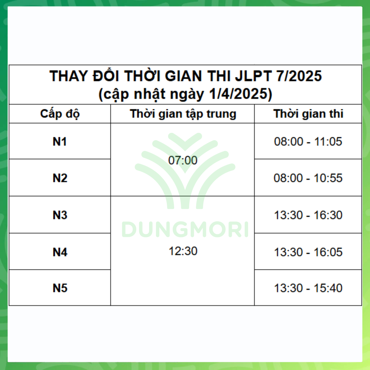 ✅ Khác biệt dễ gây nhầm lẫn: Một số năm trước, N3 thi buổi sáng nhưng từ năm 2025, N3 sẽ thi buổi chiều tại nhiều điểm thi ở Việt Nam, tương tự N4 và N5.