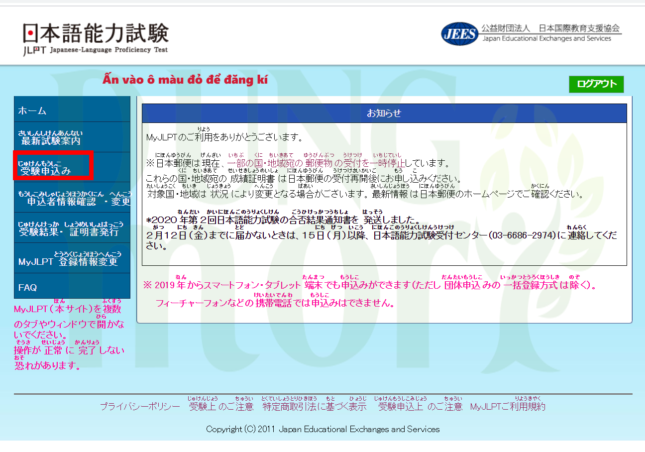 Bước 1: Các bạn truy cập vào link: https://info.jees-jlpt.jp/