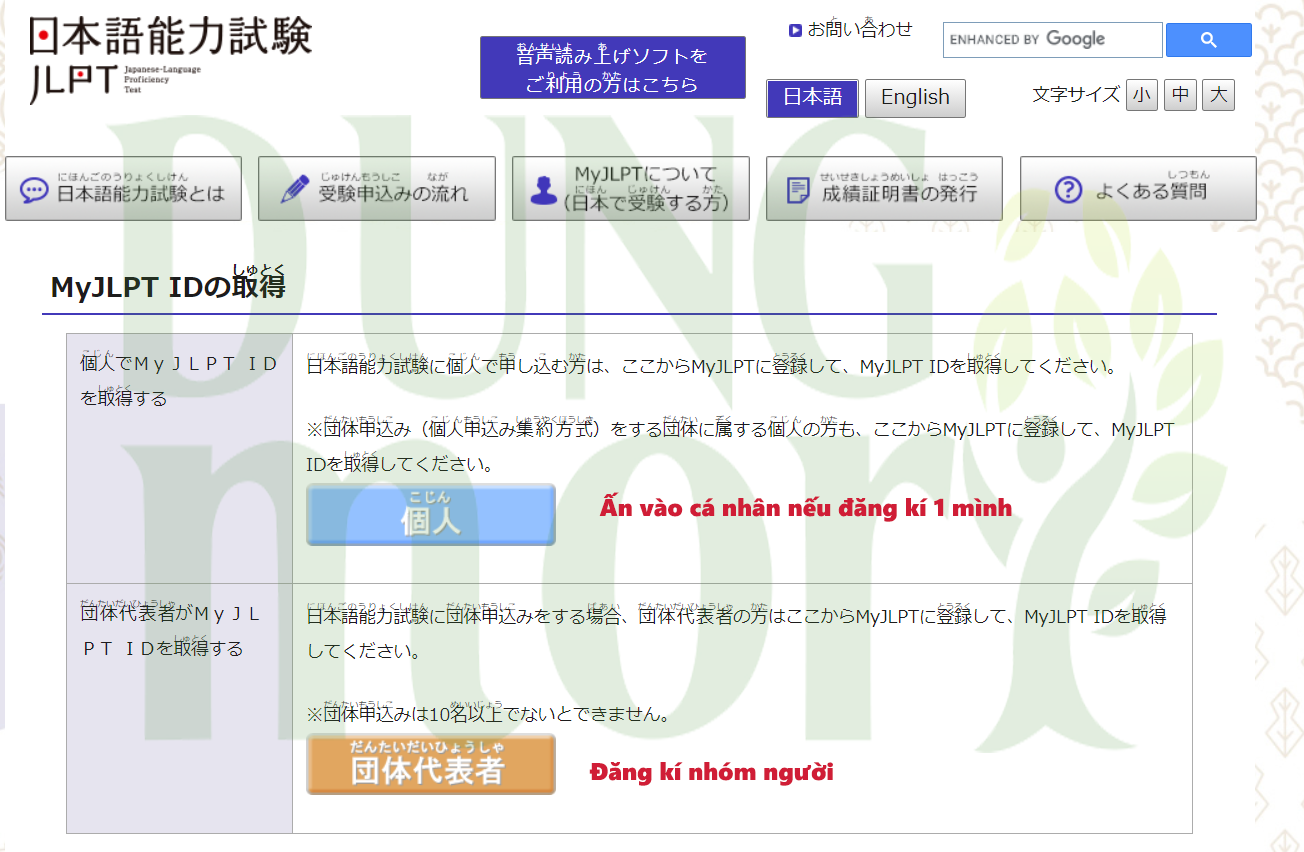 Các bạn ấn vào đăng kí MyJLPT, sau đó chọn cá nhân nếu các bạn đăng kí một mình. Các bạn ấn vào đoàn thể nếu đăng kí cho nhóm người.