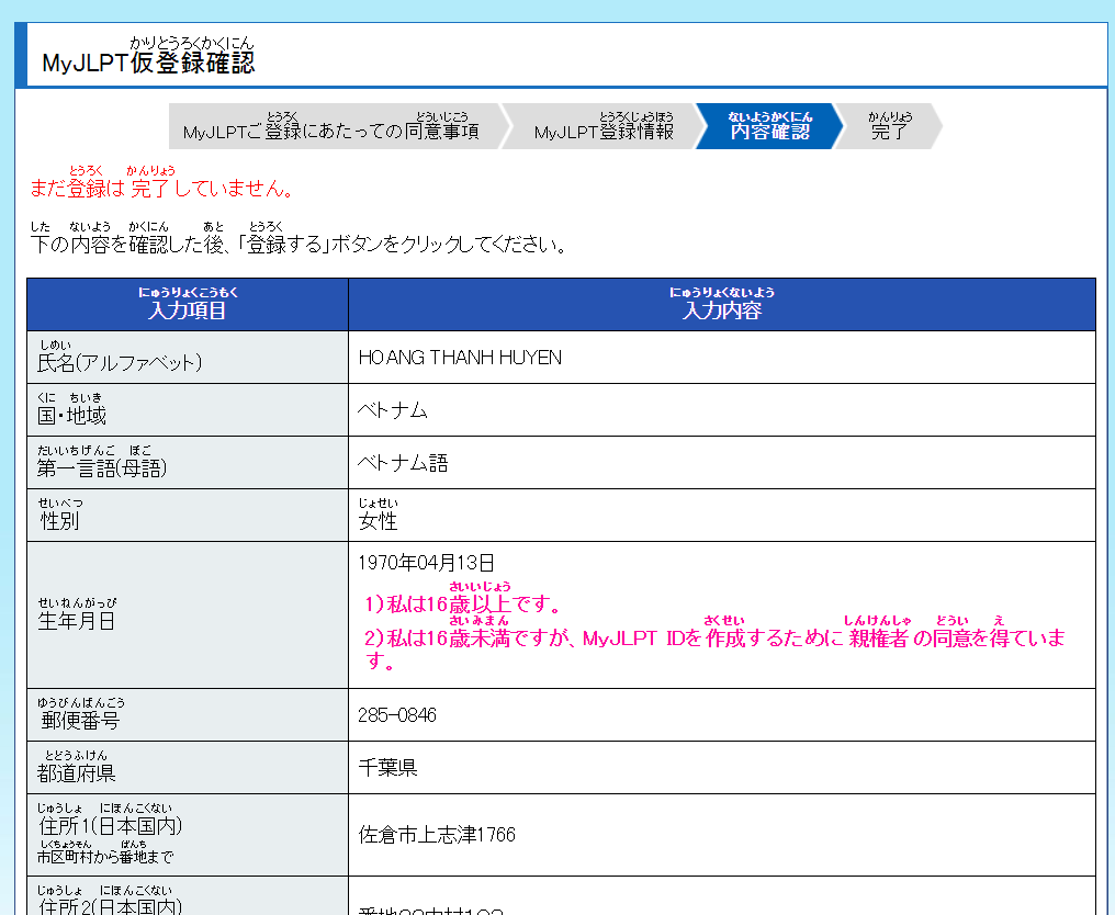 Xác nhận thông tin đăng kí và hoàn thành đăng kí MyJLPT