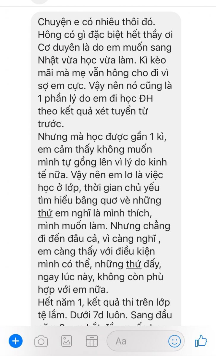 “Cơ duyên là do em muốn sang Nhật vừa học vừa làm. Kì kèo mãi mà mẹ vẫn không cho đi vì sợ em cực. Vậy nên nó cũng là 1 phần lý do em đi học Đại học theo kết quả xét tuyển từ trước. Nhưng mà học được gần 1 kì, em cảm thấy không muốn mình tự gồng lên vì lý do kinh tế nữa. Vậy nên em lơ là việc học ở lớp, thời gian chủ yếu tìm hiểu bâng quơ về những thứ em nghĩ là mình thích, mình muốn làm. Nhưng chẳng đi đến đâu cả, vì càng nghĩ , em càng thấy với điều kiện mình có thể, những thứ đấy, ngay lúc này, không còn phù hợp với em nữa.
