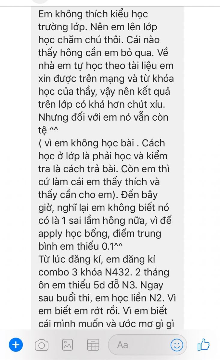 Từ lúc đăng ký, em đăng ký combo 3 khóa N4+N3+N2. 2 tháng ôn em thiếu 5 điểm đỗ N3. Ngay sau buổi thi, em học liền N2. Vì em biết em rớt rồi. Vì em biết cái mình muốn và ước mơ gì gì đó là thứ mơ hồ và xa xỉ. Thực tế có cái gì thì làm cho tốt cái đó đi. Vậy là em học.