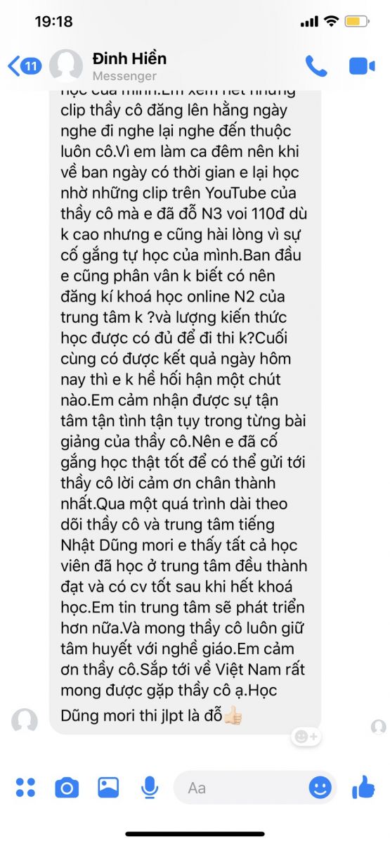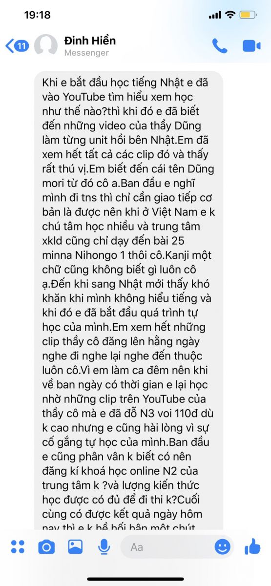 Thì khi đó e đã biết đến những video của thầy Dũng làm từng Unit hồi bên Nhật. Em đã xem hết tất cả các clip đó và thấy rất thú vị. Em biết đến cái tên Dũng mori từ đó đấy thầy cô ạ. Ban đầu e nghĩ mình đi tu nghiệp sinh thì chỉ cần giao tiếp cơ bản là được nên khi ở Việt Nam e không chú tâm học nhiều và trung tâm xuất khẩu lao động mà em đăng ký đi cũng chỉ dạy đến bài 25 Minna no Nihongo I. Về phần kiến thức Kanji thì đến ngay cả một chữ em cũng không biết gì luôn ạ. Đến khi sang Nhật mới thấy khó khăn khi mình không hiểu tiếng & khi đó em đã bắt đầu quá trình tự học của mình. Em xem hết những clip thầy cô đăng lên hằng ngày nghe đi nghe lại nghe đến thuộc luôn. Vì em làm ca đêm nên khi về ban ngày có thời gian e lại học, nhờ những clip trên YouTube của thầy cô mà e đã đỗ N3 với 110 điểm dù không cao nhưng e cũng hài lòng vì sự cố gắng tự học của mình. Ban đầu e cũng phân vân k biết có nên đăng kí khoá học online N2 của trung tâm hay không ? Và lượng kiến thức học được có đủ để đi thi không?Cuối cùng có được kết quả ngày hôm nay thì em không hề hối hận một chút nào. Em cảm nhận được sự tận tâm tận tình tận tụy trong từng bài giảng của thầy cô. Nên e đã cố gắng học thật tốt để có thể gửi tới thầy cô lời cảm ơn chân thành nhất. Qua một quá trình dài theo dõi thầy cô và trung tâm tiếng Nhật Dũng Mori em thấy tất cả học viên đã học ở trung tâm đều thành đạt và tìm được một công việc tốt sau khi hết khoá học. Em tin trung tâm sẽ phát triển hơn nữa ạ. Và mong thầy cô luôn giữ tâm huyết với nghề giáo. Em cảm ơn thầy cô. Sắp tới về Việt Nam rất mong được gặp thầy cô ạ.
